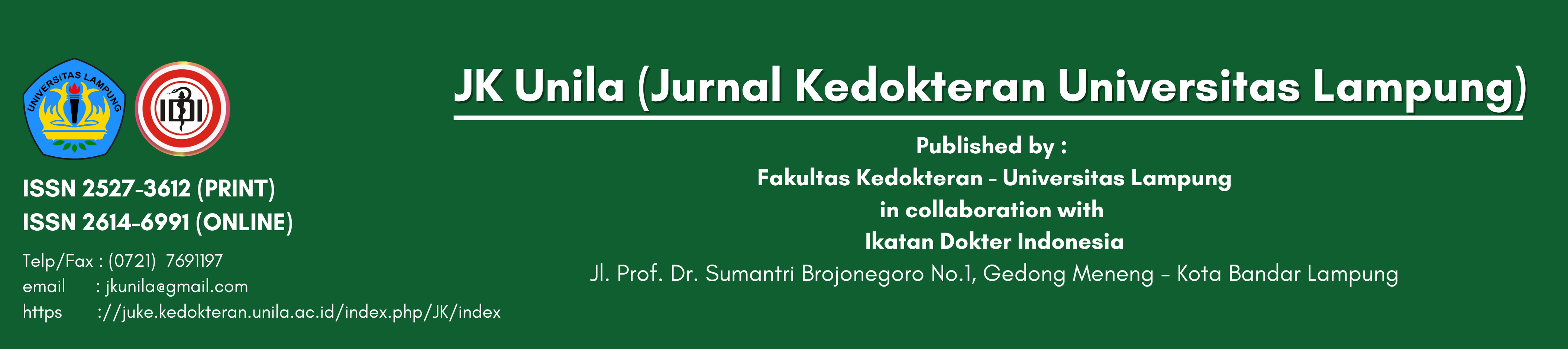JK Unila (Jurnal Kedokteran Universitas Lampung) is a journal of scientific publications published every six months using a peer review system for article selection. Jurnal Kedokteran Universitas Lampung (JK Unila) can receive original research articles relevant to medicine and health, meta-analysis , case reports and medical science update.  JK Unila is intended to ensure that only good paper is published. All incoming manuscripts are peer-reviewed at least 2 (two) reviewers, before being accepted for publication.  The reviewers remain anonymous to the author throughout and following the refereeing process. At the same time,   the identity of the author is also unknown to the reviewers. Each manuscript is basically reviewed by two reviewers. The criteria which are asked reviewers i.e. the originality, clarity of of the method and the result, correctly cied  previous relevant work.  The common time for  refereeing process is approximately 4 week.  Reviewers are carefully selected from the nationally university and research community.
